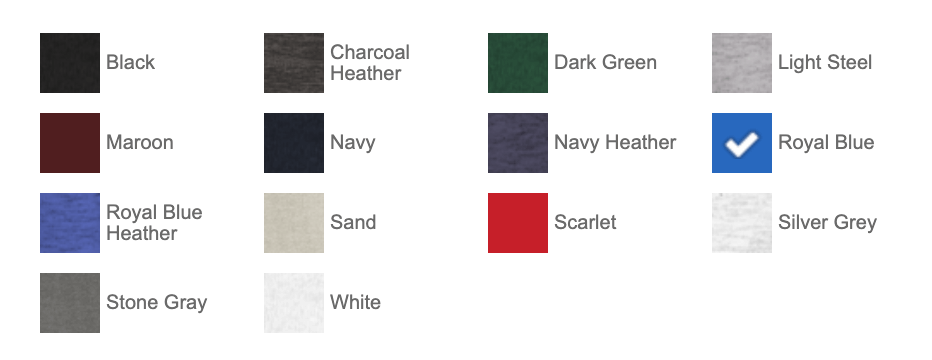 | Color | Black, Charcoal Heather, Dark Green, Light Steel, Maroon, Navy, Navy Heather, Royal Blue, Royal Blue Heather, Sand, Scarlet, Silver Grey, Stone Grey, White |
