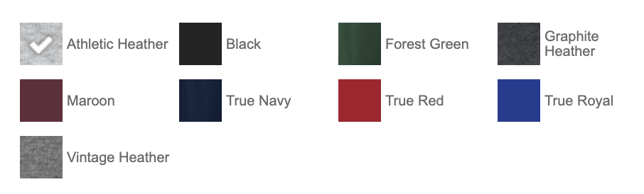 Athletic Heather, Black, Forest Green, Graphite Heather, Maroon, True Navy, True Red, True Royal, Vintage Heather