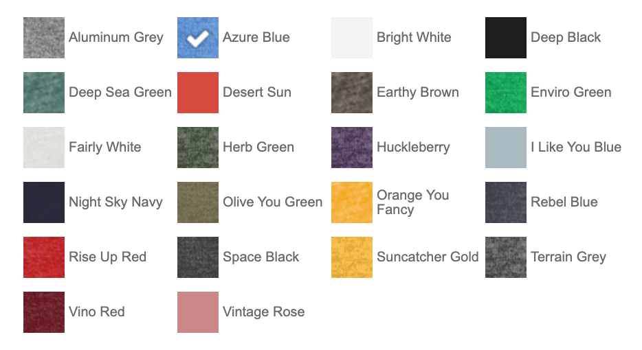 | Color | Aluminum Grey, Azure Blue, Bright White, Deep Black, Deep Sea Green, Desert Sun, Earthy Brown, Enviro Green, Fairly White, Herb Green, Huckleberry, I Like You Blue, Night Sky Navy, Olive You Green, Orange You Fancy, Rebel Blue, Rise Up Red, Space Black, Suncatcher Gold, Terrain Grey, Vino Red, Vintage Rose |