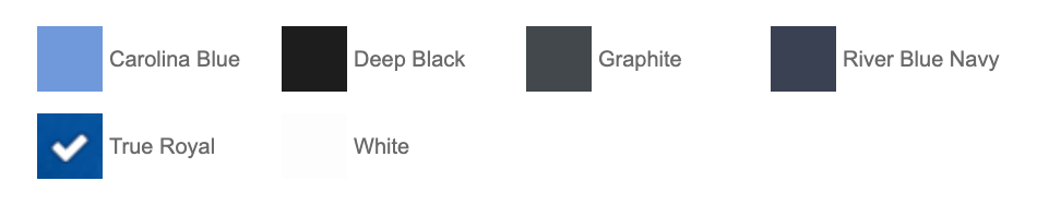 Carolina Blue, Deep Black, Graphite, River Blue Navy, True Royal, White