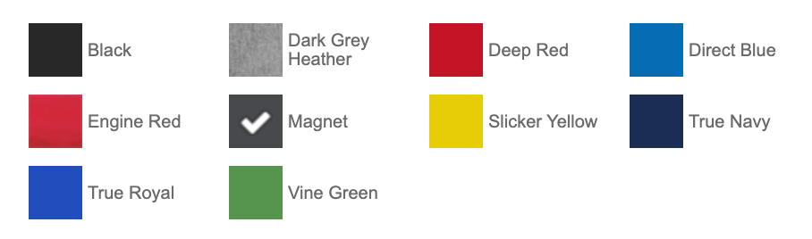 | Color | Black, Dark Grey Heather, Deep Red, Direct Blue, Engine Red, Magnet, Slicker Yellow, True Navy, True Royal, Vine Green |
